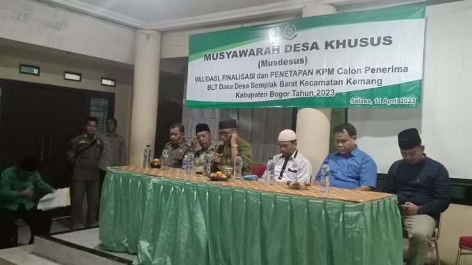 Kabarindonesianews-Babinsa Semplak Barat pada pukul 20:30 sampai dengan selesai menghadiri acara Musyawarah Desa Khusus ( MUSDESUS ) tentang Validasi , Finalisasi dan Penetapan KPM calon penerima BLT Dana Desa tahun anggaran 2023 bertempat di Aula Kantor Desa Semplak barat Kp semplak Kaum Rt 02 Rw 03 Desa semplak Barat Kecamatan Kemang Kab Bogor, Selasa 11 april 2023.